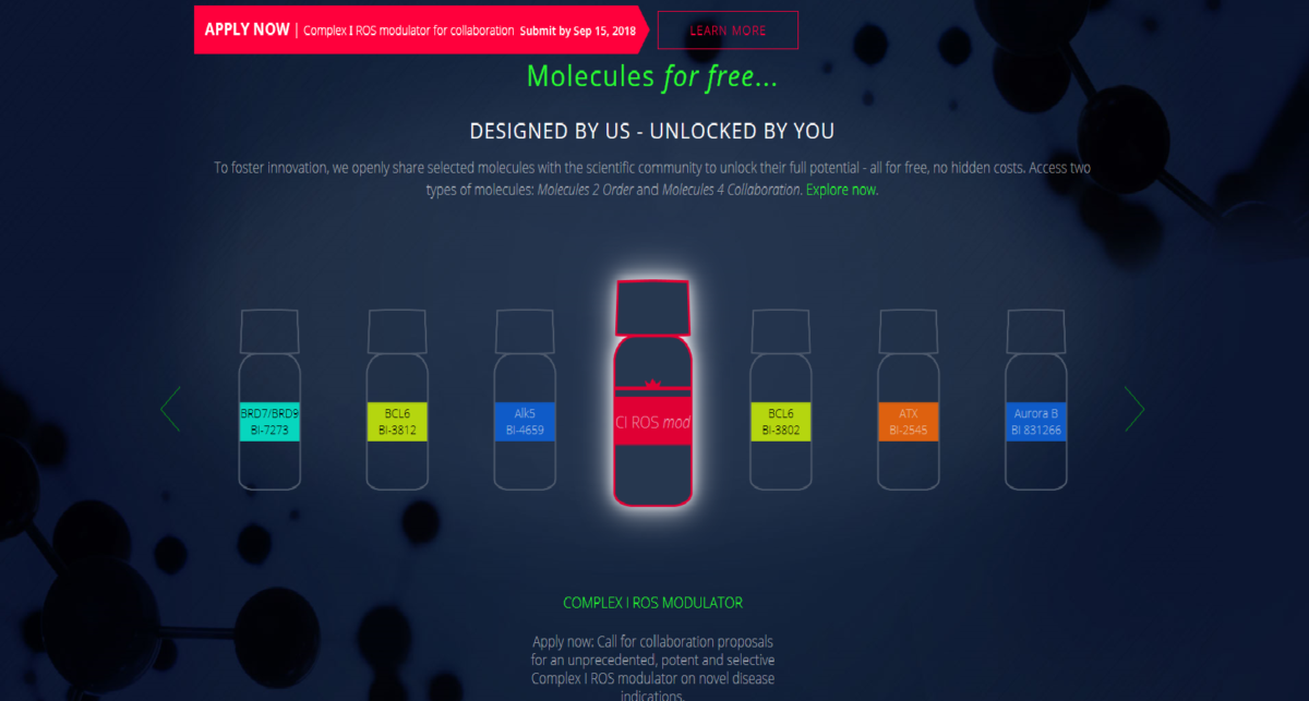 • Για ορισμένα μόρια η επιλογή του πληθοπορισμού (crowdsourcing) προσφέρει την ευκαιρία έναρξης κοινών ερευνητικών έργων. Επιστήμονες οι οποίοι ενδιαφέρονται για μόρια αυτού του τύπου προσκαλούνται να υποβάλλουν την ερευνητική τους πρόταση. Εφόσον η πρόταση επιλεχθεί, αυτή θα αναπτυχθεί σε συνεργασία με τους επιστήμονες της Boehringer Ingelheim