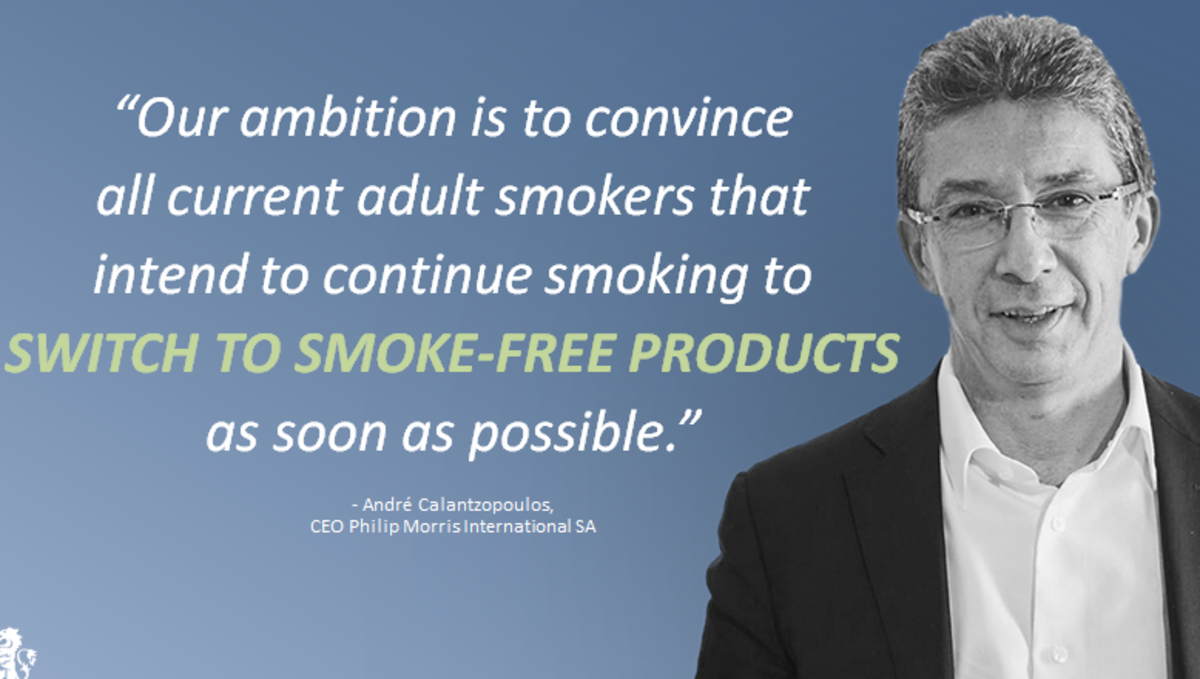 Όπως διαβάζει κανείς στο μότο που αναφέρεται στην φωτογραφία παρακάτω, «η φιλοδοξία μας είναι να πείσουμε τους σημερινούς ενήλικες καπνιστές που σκοπεύουν να συνεχίζουν να καπνίζουν, να περάσουν στη χρήση των προϊόντων χωρίς καπνό, και όσο το δυνατό πιο γρήγορα!».