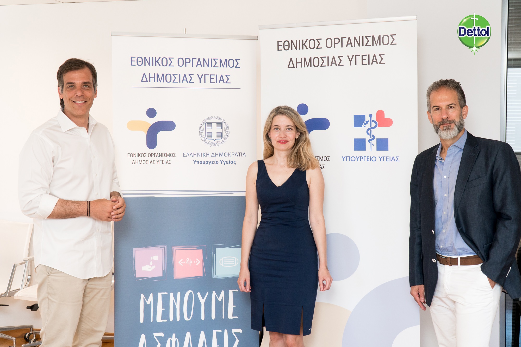 Από αριστερά: Ο κ. Παναγιώτης Αρκουμανέας, Πρόεδρος ΕΟΔΥ, η κυρία Φωτεινή Κωνσταντακοπούλου, Senior Brand Manager Dettol & Media/Digital Lead, RECKITT BENCKISER HELLAS HEALTHCARE A.E. και ο κ. Νίκος Τσακαλάκης, Πρόεδρος & Διευθύνων Σύμβουλος, RECKITT BENCKISER HELLAS HEALTHCARE A.E.