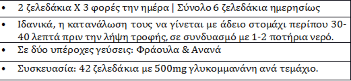 Η γλυκομαννάνη, είναι ένα 100% φυτικό συστατικό και πιο συγκεκριμένα ένας πολυσακχαρίτης με τη μορφή υδατοδιαλυτής φυτικής ίνας η οποία προέρχεται από τις ρίζες του φυτού Konja. Ο ρόλος των φυτικών ινών στη διαχείριση του βάρους και στην υγεία είναι γεγονός. Συγκεκριμένα, η δράση της γλυκομαννάνης ξενικά όταν εισέλθει στο στομάχι, απορροφά νερό και δημιουργεί μια μορφή τζελ. Όταν συνοδευτεί με δύο ποτήρια νερό, χάρη της ιδιότητάς της τείνει να απορροφά περισσότερη ποσότητα νερού ως και 100 με 200 φορές το βάρος της με αποτέλεσμα να εναποτίθεται στο έντερο και συμβάλλει στην αίσθηση κορεσμού βοηθώντας στη μειωμένη πρόσληψη θερμίδων και απώλεια σωματικού βάρους.
