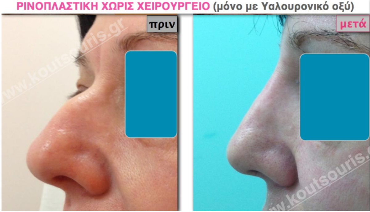 Μετά την έγχυση του υαλουρονικού οξέως στην περιοχή της μύτης γίνεται εφαρμογή πάγου τοπικά για περίπου 30΄ με 1 ώρα. Το αποτέλεσμα φαίνεται αμέσως χωρίς να υπάρχουν συνήθως εμφανή σημάδια οπότε μπορεί κανείς να επιστρέψει άμεσα στη δουλειά του.