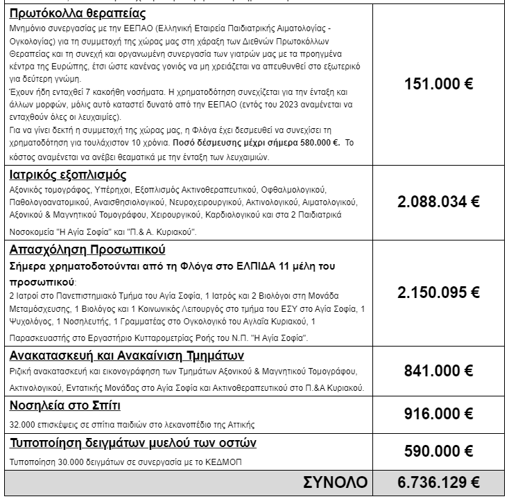 Δεν περιλαμβάνονται μικρότερα ποσά για την καθημερινή προμήθεια αναλωσίμων, ηλεκτρικών συσκευών, αποστολής δειγμάτων ιστών στο εξωτερικό, παρακολούθηση συνεδρίων στο εξωτερικό ιατρών/νοσηλευτών, επιστημονικές δημοσιεύσεις κ.λπ. στο ΕΛΠΙΔΑ.