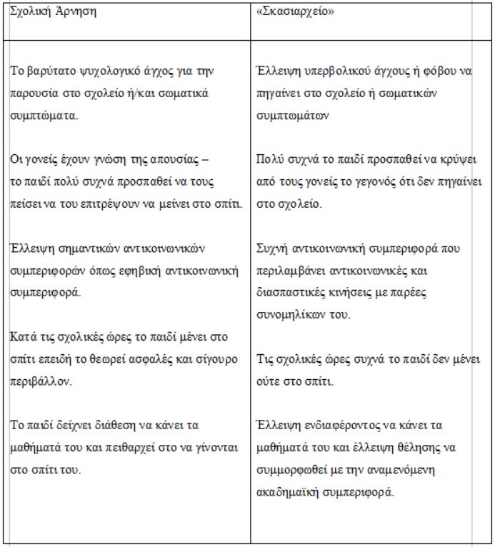 Αν τα παραπάνω έχουν παρατηρηθεί συχνά μέσα σ’ ένα συγκεκριμένο χρονικό διάστημα στο παιδί, το πρόβλημα αποκτάει μεγαλύτερη διάσταση από ότι θα ήταν εάν το παιδί έκανε απλά «σκασιαρχείο». Υπάρχουν βασικές διαφορές στις δύο συμπεριφορές οι οποίες μας βοηθάνε στον έγκαιρο εντοπισμό της σχολικής άρνησης: