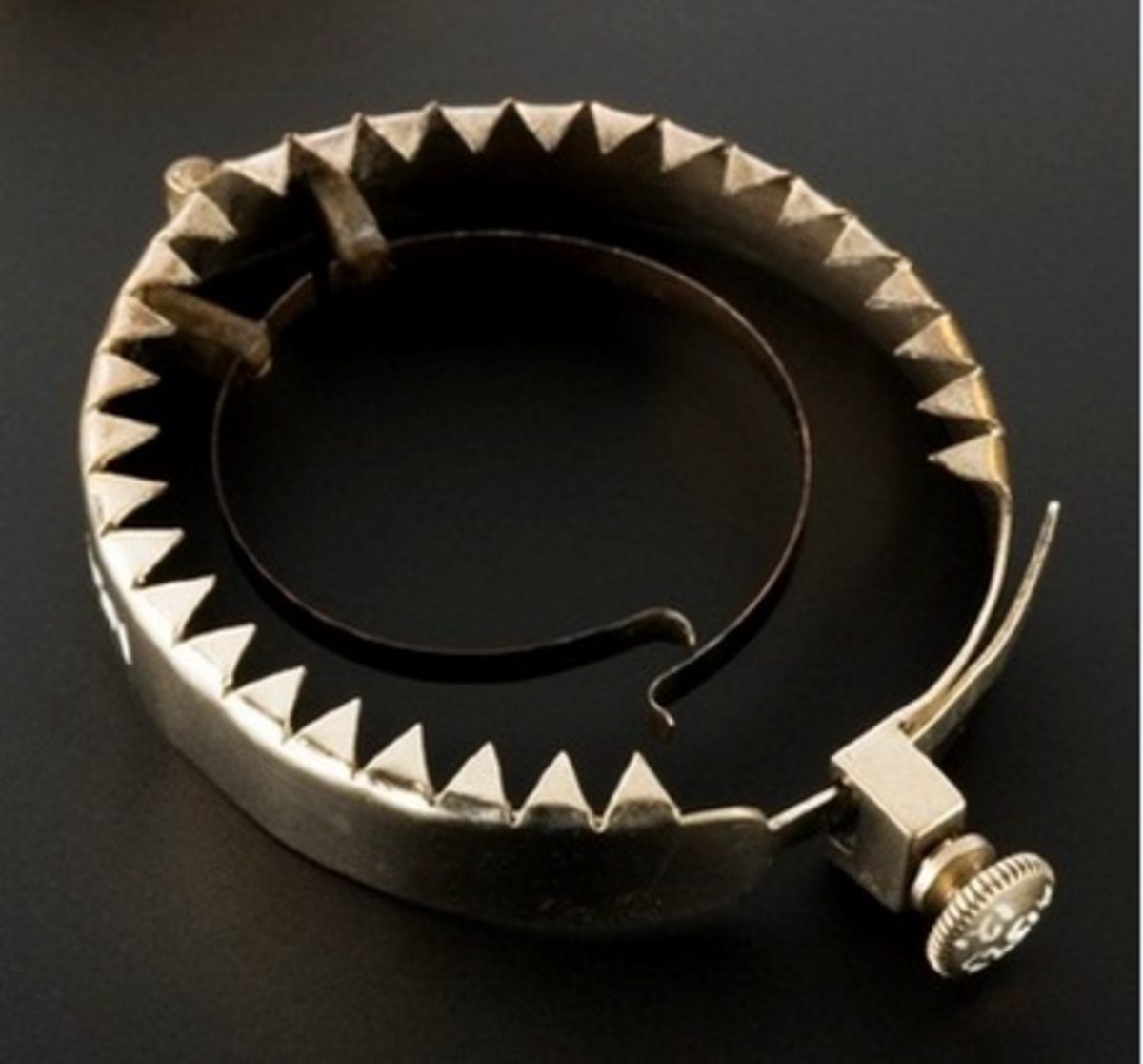 Και αυτό το πραγματικά βάρβαρο εργαλείο ήταν αποκλειστικά για άνδρες και χρησιμοποιήθηκε από το 1880 μέχρι το 1920 (μόνο για 40 χρόνια ευτυχώς). Όπως μπορείτε να δείτε, μοιάζει με παγίδα για αρκούδες. Το συγκεκριμένο μηχάνημα ήταν αποτρεπτικό όχι απλά για τον αυνανισμό αλλά για τη στύση και μάλιστα τη νυχτερινή στύση, εκείνη που έρχεται όταν κοιμόμαστε. Ο άνδρας πριν κοιμηθεί το τοποθετούσε στη βάση του πέους του και το έσφιγγε. Αν ήταν άτυχος κατά τη διάρκεια του ύπνου του να έρθει σε στύση τότε το δαχτυλίδι έκλεινε και από τη σφίξη τα μεταλλικά του δόντια έκαναν το πέος να “επανέλθει στην προτέρα ήρεμη κατάσταση”.