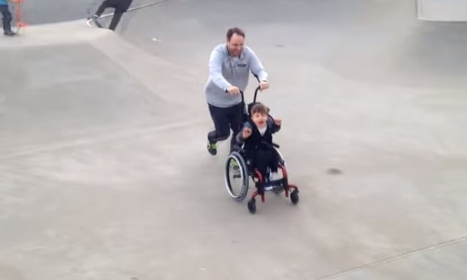 Ένα βίντεο που απεικονίζει τον πατέρα ενός μικρού παιδιού με εγκεφαλική παράλυση να το σπρώχνει με το αναπηρικό καροτσάκι...