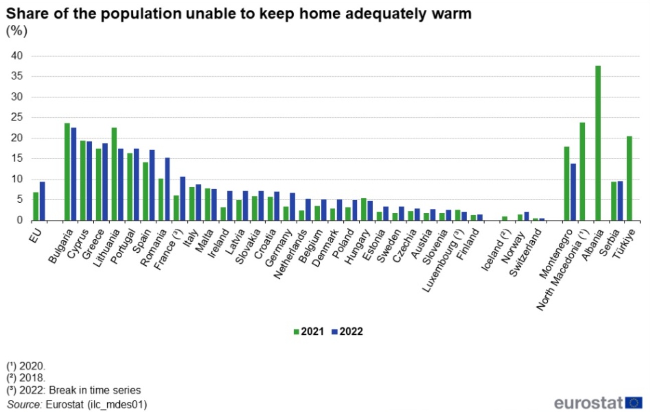 Το 2022, το 9,3% του πληθυσμού της ΕΕ κατά μέσον όρο δεν είχε τη δυνατότητα να ζει σε σπίτι επαρκώς ζεστό. Το ποσοστό αυτό, όμως, παρουσίαζε τεράστια διακύμανση μεταξύ των κρατών. Κυμαινόταν από 1,4% στην Φινλανδία έως 22,5% στη Βουλγαρία.