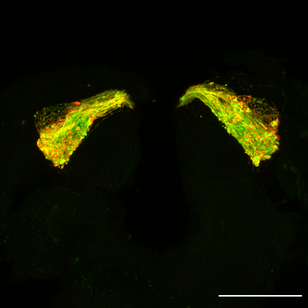 Εικόνα του εγκεφάλου μιας φρουτόμυγας ηλικίας επτά ημερών. Το πράσινο χρώμα περιγράφει τους νευρώνες, οι οποίοι αρχίζουν να διογκώνονται και να εκφυλίζονται λόγω της πρωτεΐνης Tau. Το κόκκινο χρώμα δείχνει τα σημεία, όπου η Tau συσσωρεύεται σε ομάδες κατά μήκος των νευρώνων.