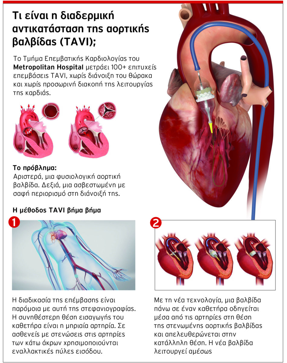 Τα πιστοποιηµένα κέντρα για επεµβάσεις TAVI είναι λίγα στη χώρα µας. Ένα από αυτά είναι το Metropolitan Hospital. Ακόµα λιγότερα είναι τα κέντρα που µπορούν να παρουσιάσουν έναν αριθµό επιτυχών επεµβάσεων TAVI ανάλογο µε αυτόν του Τµήµατος Επεµβατικής Καρδιολογίας του Metropolitan Hospital, όπου µια έµπειρη οµάδα εξοπλισµένη µε τεχνολογία τελευταίας γενιάς παρέχει τις πιο σύγχρονες θεραπείες µέσα σε ένα ασφαλές περιβάλλον.