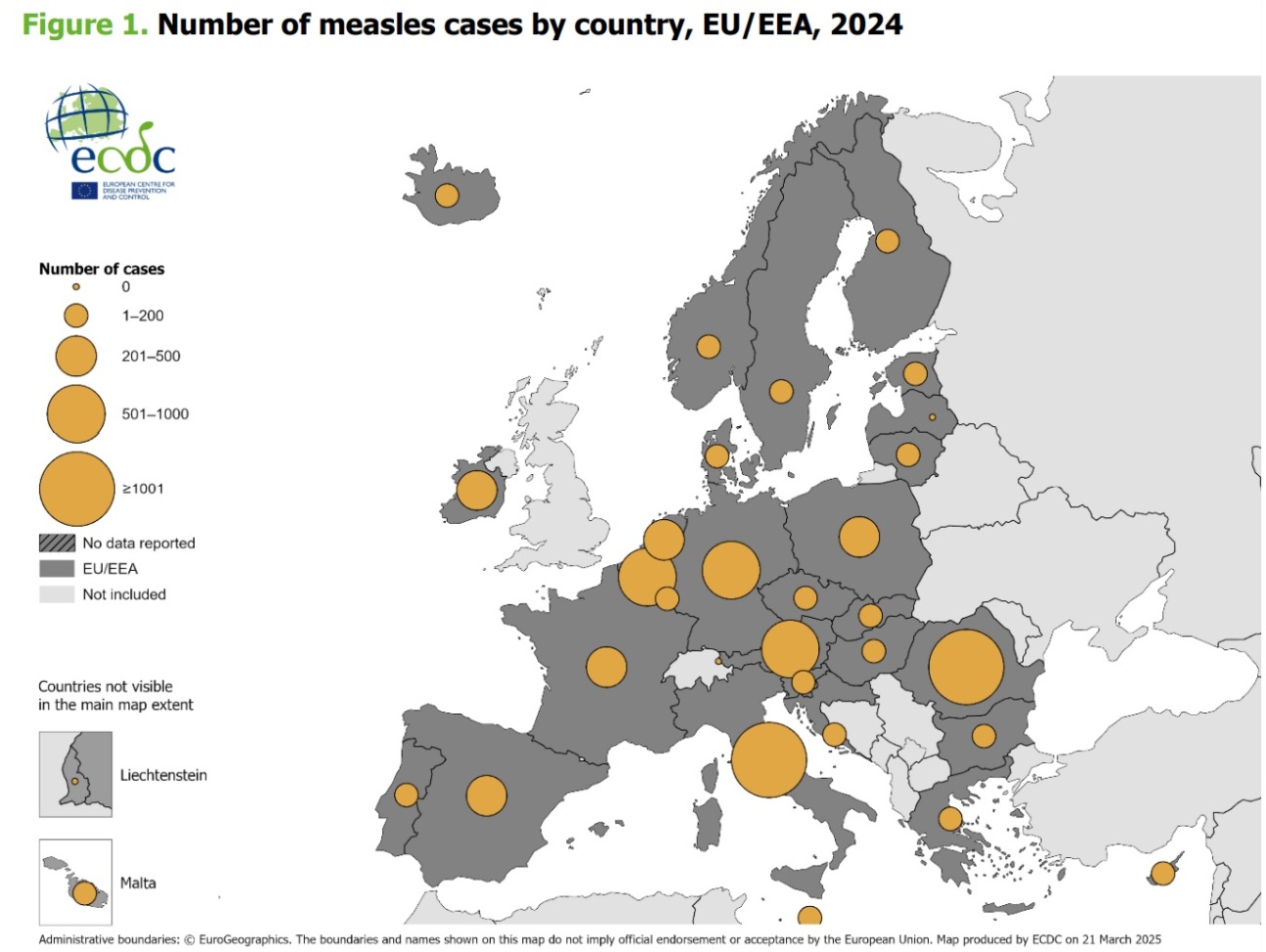 Μόνον η Ουγγαρία, η Μάλτα και η Πορτογαλία έχουν το επιθυμητό ποσοστό κάλυψης του 95% (ή υψηλότερο) των παιδιών τους και με τις δύο δόσεις του εμβολίου. Στις υπόλοιπες οι εμβολιασμοί των παιδιών είναι ανεπαρκείς, εξ ου και η αύξηση των κρουσμάτων.