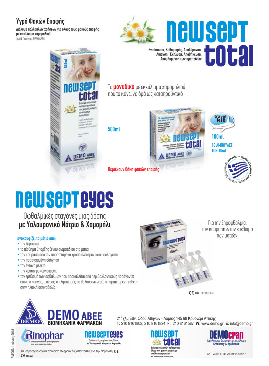 Η DEMO ABEE με την επιτυχημένη διάθεση στην Ελληνική αγορά των Νewsept plus, Newsept total και Νewsept Εyes δίνει τη λύση «με τη βοήθεια της φύσης» σε όσους αντιμετωπίζουν προβλήματα ξηροφθαλμίας, ταλαιπωρούνται από κουρασμένα κι ερεθισμένα μάτια ή φορούν φακούς επαφής.