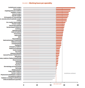 Οι διαφορές μεταξύ ειδικοτήτων είναι επίσης εμφανείς . Πανευρωπαϊκά, οι χειρουργικές ειδικότητες καταγράφουν τον υψηλότερο μέσο χρόνο εργασίας (62 ± 17 ώρες), ενώ ακολουθούν οι κλινικές ειδικότητες (56 ± 16). Ωστόσο, στην Ελλάδα το επίπεδο ωρών παραμένει ιδιαίτερα αυξημένο σε όλες τις κατηγορίες.