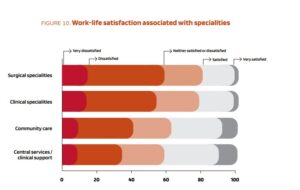 Η υπερεργασία αποτυπώνεται και στην εργασιακή ικανοποίηση. Σε πανευρωπαϊκό επίπεδο, το 32% των ειδικευόμενων δηλώνει δυσαρέσκεια ή έντονη δυσαρέσκεια από την εργασία του, ενώ επιπλέον 23% εκφράζει αμφιθυμία. Συνολικά, περισσότεροι από τους μισούς δεν βιώνουν θετική επαγγελματική εμπειρία.