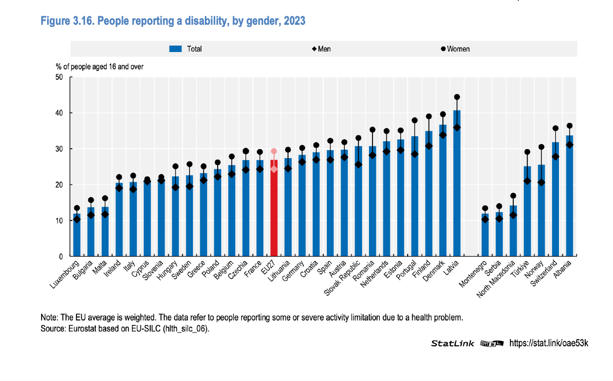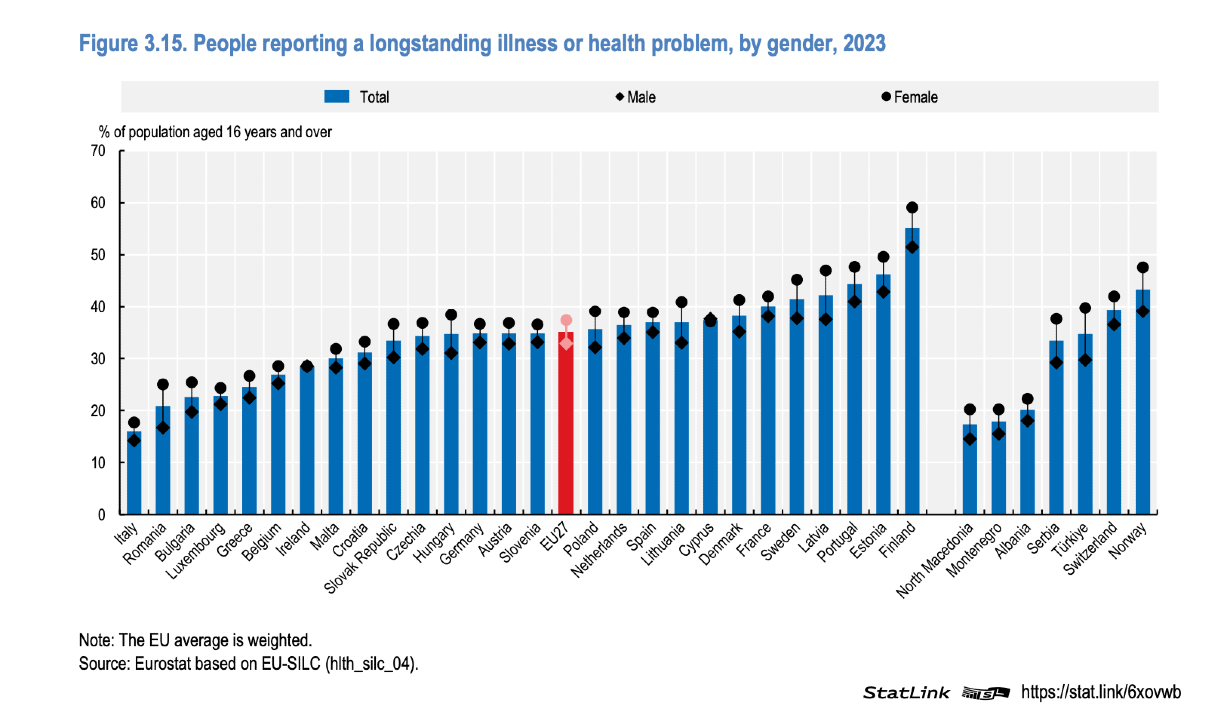 Ενώ το προσδόκιμο ζωής κατά τη γέννηση έχει αυξηθεί κατά μέσο όρο πάνω από τέσσερα χρόνια σε ολόκληρη την ΕΕ, μεταξύ 2000 και 2023, πολλά χρόνια της ζωής σε μεγάλη ηλικία ζουν με χρόνιες ασθένειες και αναπηρίες.