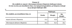 Το 30,5% του πληθυσμού ηλικίας 16 ετών και άνω που χρειάστηκε οδοντιατρική εξέταση ή θεραπεία, δηλώνει ότι δεν υποβλήθηκε σε αυτήν, παρότι τη χρειαζόταν.