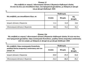 Το 20,0% δηλώνει ότι δεν υποβλήθηκε σε ιατρική εξέταση ή θεραπεία λόγω οικονομικών δυσκολιών, μεγάλων λιστών αναμονής ή απόστασης από τον γιατρό.