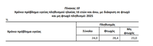 Το 24,0% του πληθυσμού ηλικίας 16 ετών και άνω δηλώνει ότι αντιμετωπίζει χρόνιο πρόβλημα υγείας, με το υψηλότερο ποσοστό να καταγράφεται στον φτωχό πληθυσμό, σε σύγκριση με τον μη φτωχό.