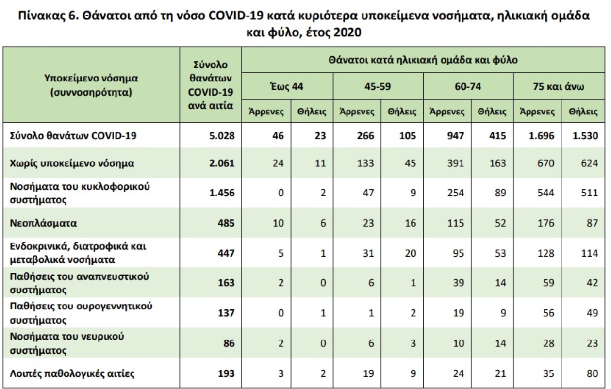 Σύμφωνα με τα δεδομένα της ΕΛΣΤΑΤ, κατά τον πρώτο χρόνο της πανδημίας χάθηκαν με ή από τη λοίμωξη που προκαλεί ο κορωνοϊός συνολικώς 5.028 άτομα όλων των ηλικιών. Μεταξύ των θανόντων συμπεριλαμβάνονται 7 παιδιά και νέοι ηλικίας 15-29 ετών. Σχεδόν οι έξι στους δέκα απ’ όσους κατέληξαν (το 59%) ήσαν άνδρες.