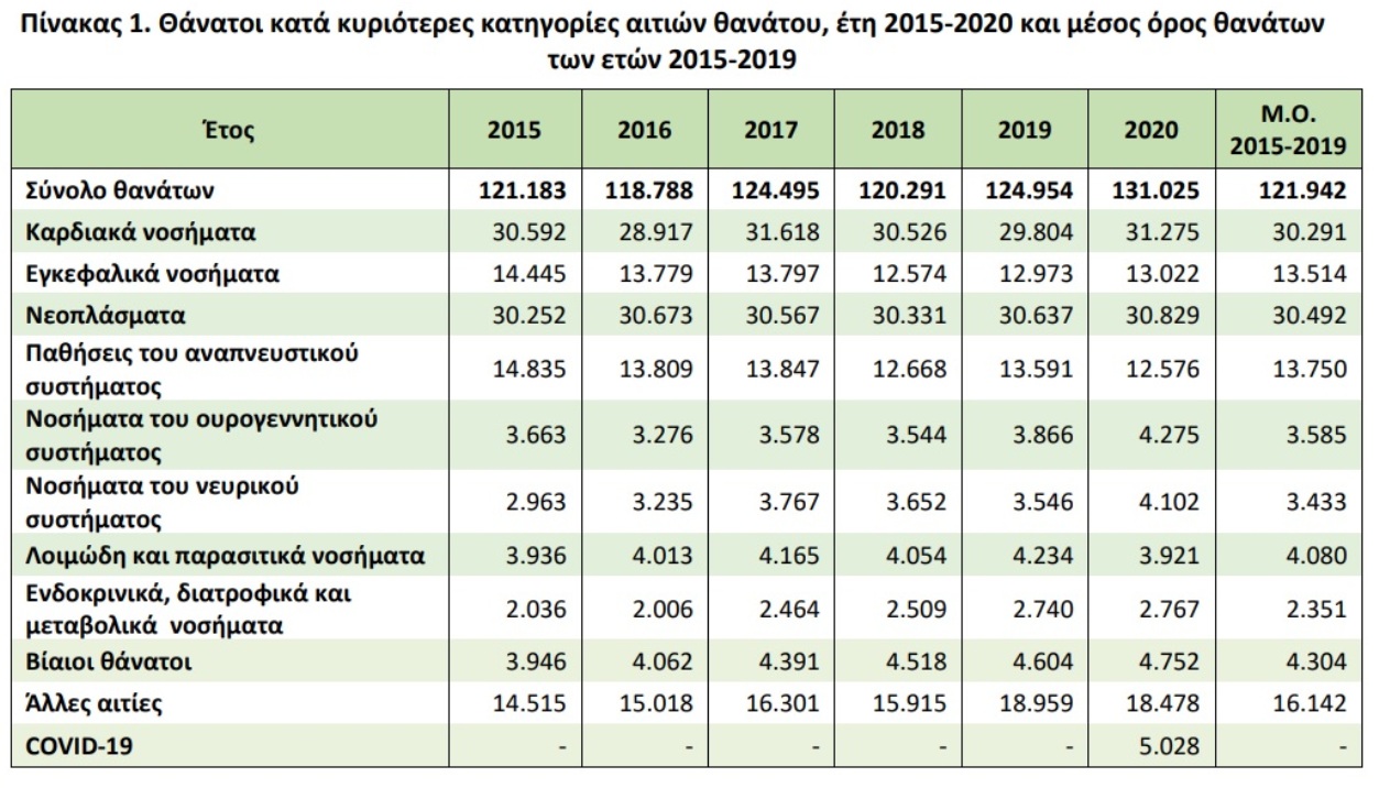 Ειδικότερα, από καρδιαγγειακά νοσήματα πέθαναν πάνω από 44.000 άνθρωποι. Οι θάνατοι από καρκίνο ξεπέρασαν τις 30.000. Και οι θάνατοι από πνευμονοπάθειες ξεπέρασαν τις 12.000. Οι θάνατοι αυτοί, όμως, δεν συμπεριλαμβάνουν εκείνους από τον κορωνοϊό.