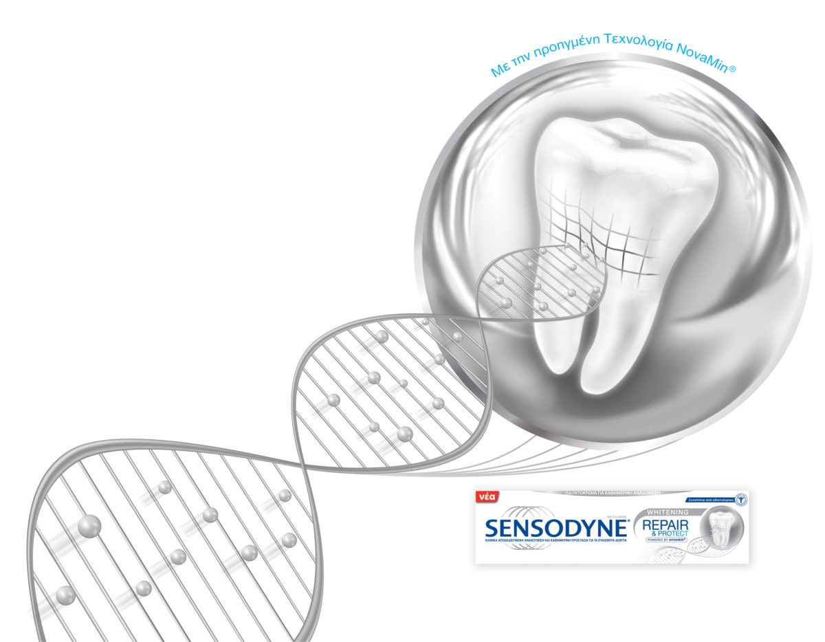 Υπάρχει λύση. Η Sensodyne Repair & Protect, κυκλοφορεί με νέα σύνθεση που βοηθά στην αποκατάσταση της φυσικής λευκότητας των δοντιών σας. Και μάλιστα με πολύ εύκολο τρόπο. Καθημερινό βούρτσισμα 2 φορές, και θα δείτε θαύματα. Χάρη στην προηγμένη τεχνολογία NovaMin, η Sensodyne Repair & Protect Whitening, εντοπίζει και αναδομεί τα ευαίσθητα σημεία που προκαλούν τον πόνο της ευαισθησίας, ενώ ταυτόχρονα λευκαίνει τα δόντια σας.