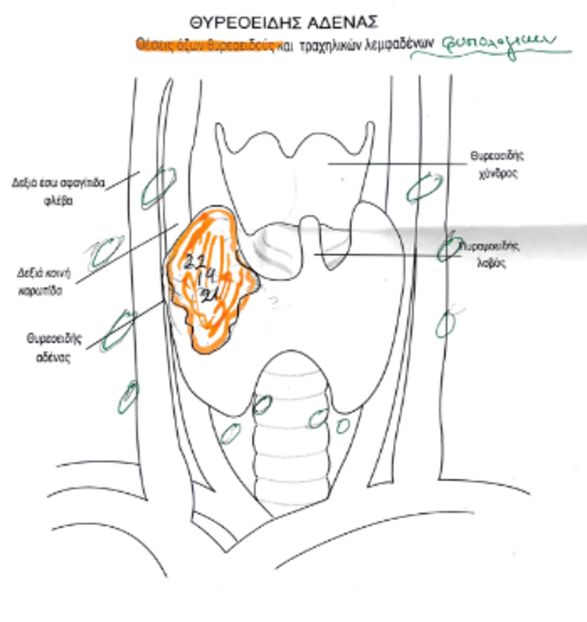 Όταν τεκμηριώσουμε τη διάγνωση του καρκίνου στο θυρεοειδή αδένα, είναι απαραίτητη η χαρτογράφηση των λεμφαδένων του τραχήλου πριν την εγχείρηση. Ο έμπειρος ακτινολόγος με το υπερηχογράφημα εντοπίζει και αξιολογεί τους λεμφαδένες του λαιμού που βρίσκονται γύρω από το θυρεοειδή αδένα.