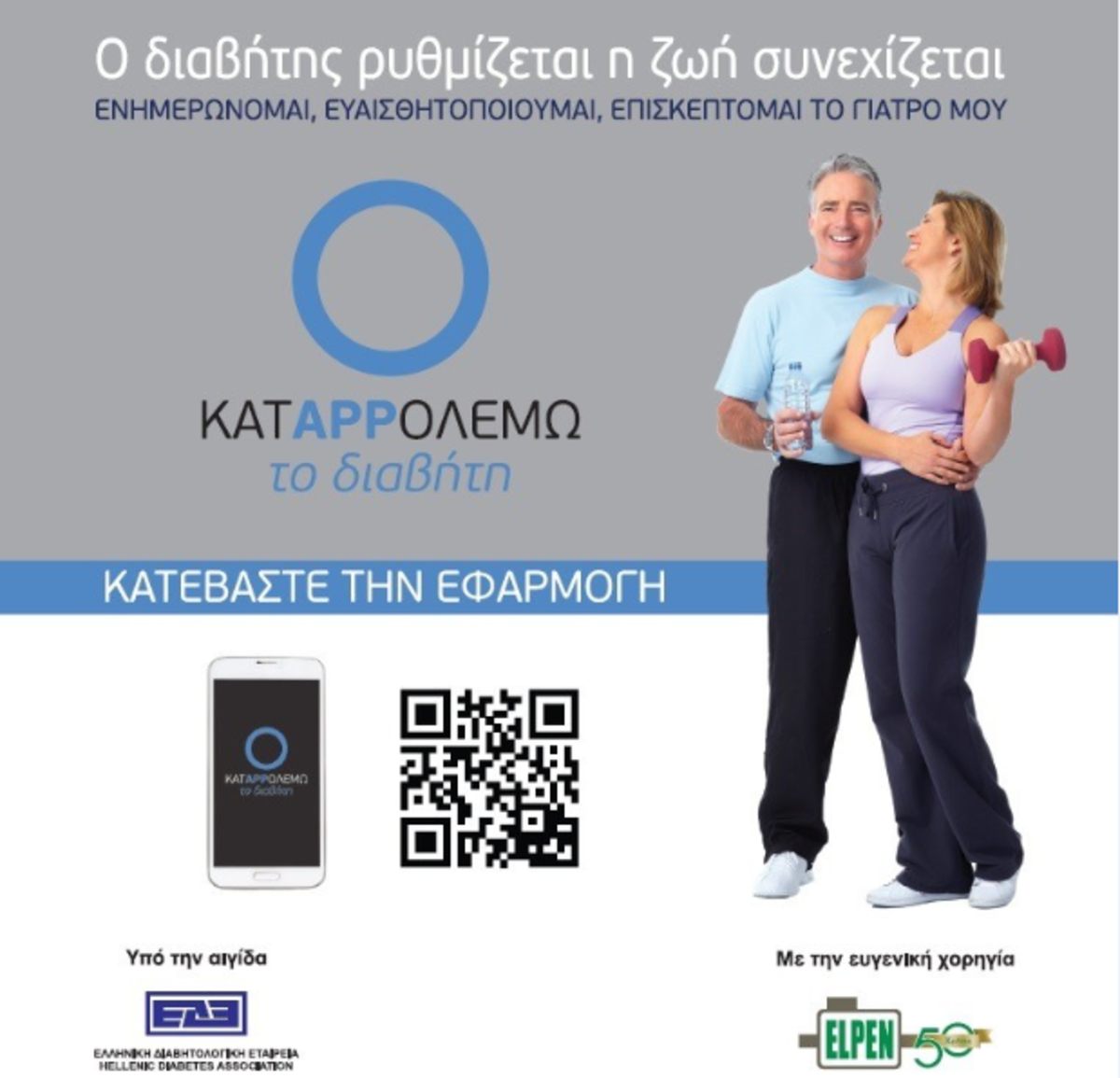 Το πρωτοποριακό application «Κατappολεμώ το Διαβήτη!» που δημιουργήθηκε από την Ελληνική Διαβητολογική Εταιρεία (Ε.Δ.Ε.) με την υποστήριξη της ELPEN, είναι πλέον διαθέσιμο να το αποκτήσουν στο «έξυπνο» κινητό ή tablet τους τα άτομα με διαβήτη. Στόχος αυτής της εφαρμογής είναι να λειτουργήσει ως ο καθημερινός σύμβουλος των ατόμων με διαβήτη τύπου 2 σε σημαντικά θέματα που αφορούν στη διαχείριση του Διαβήτη.