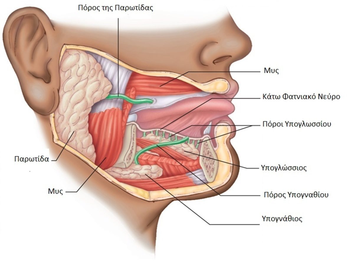 Στους μείζονες αδένες όπως, οι παρωτίδες, οι υπογνάθιοι και οι υπογλώσσιοι αδένες και στους ελάσσονες-μικρούς αδένες που είναι 600-1000 και βρίσκονται διάσπαρτοι στο ανώτερο αναπνευστικό σύστημα.