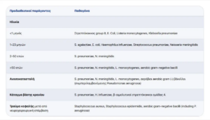 Τα αίτια της βακτηριακής μηνιγγίτιδας διαφοροποιούνται ανάλογα με την ηλικία και άλλους προδιαθεσικούς παράγοντες που απεικονίζονται στον πίνακα.