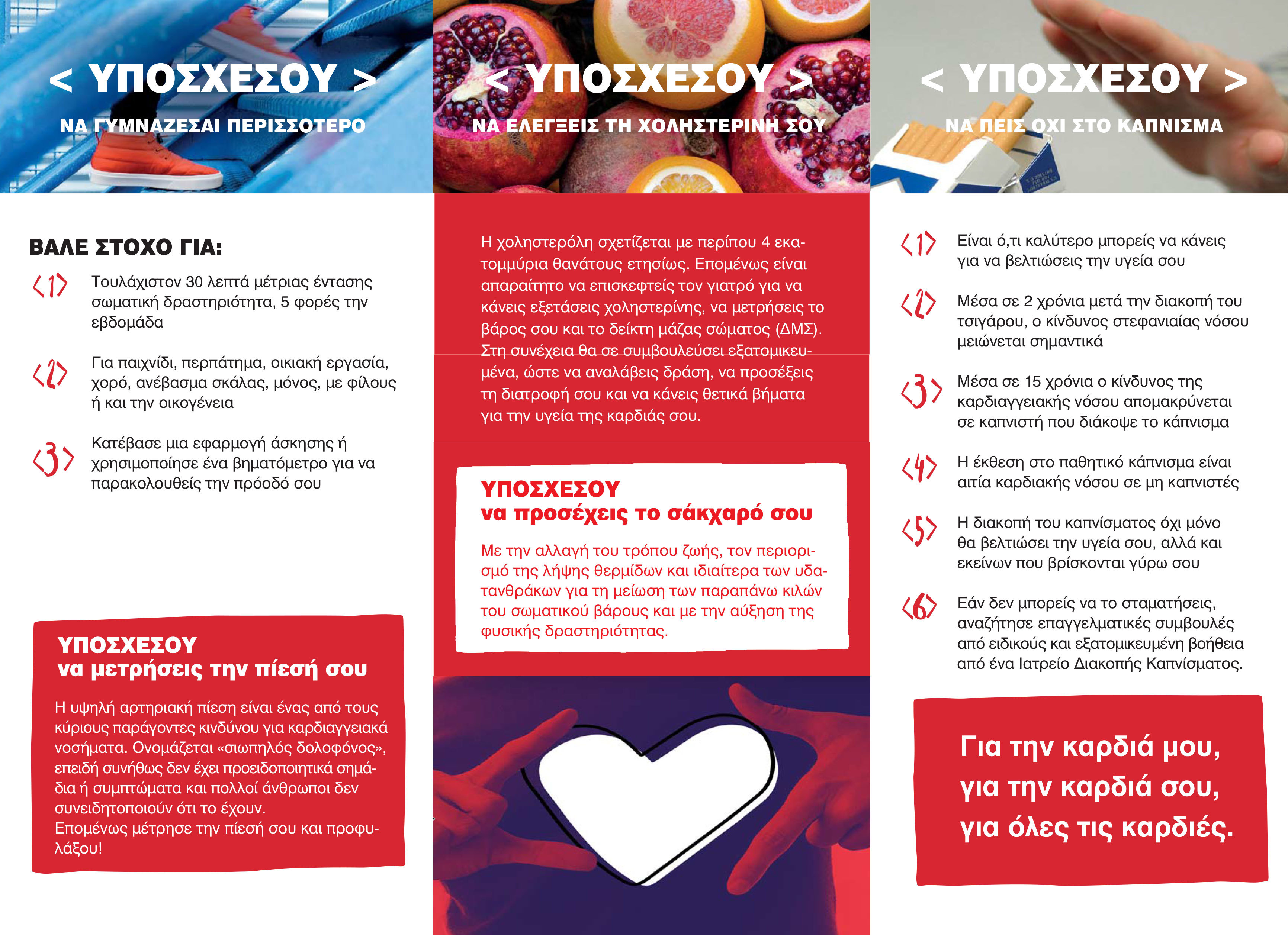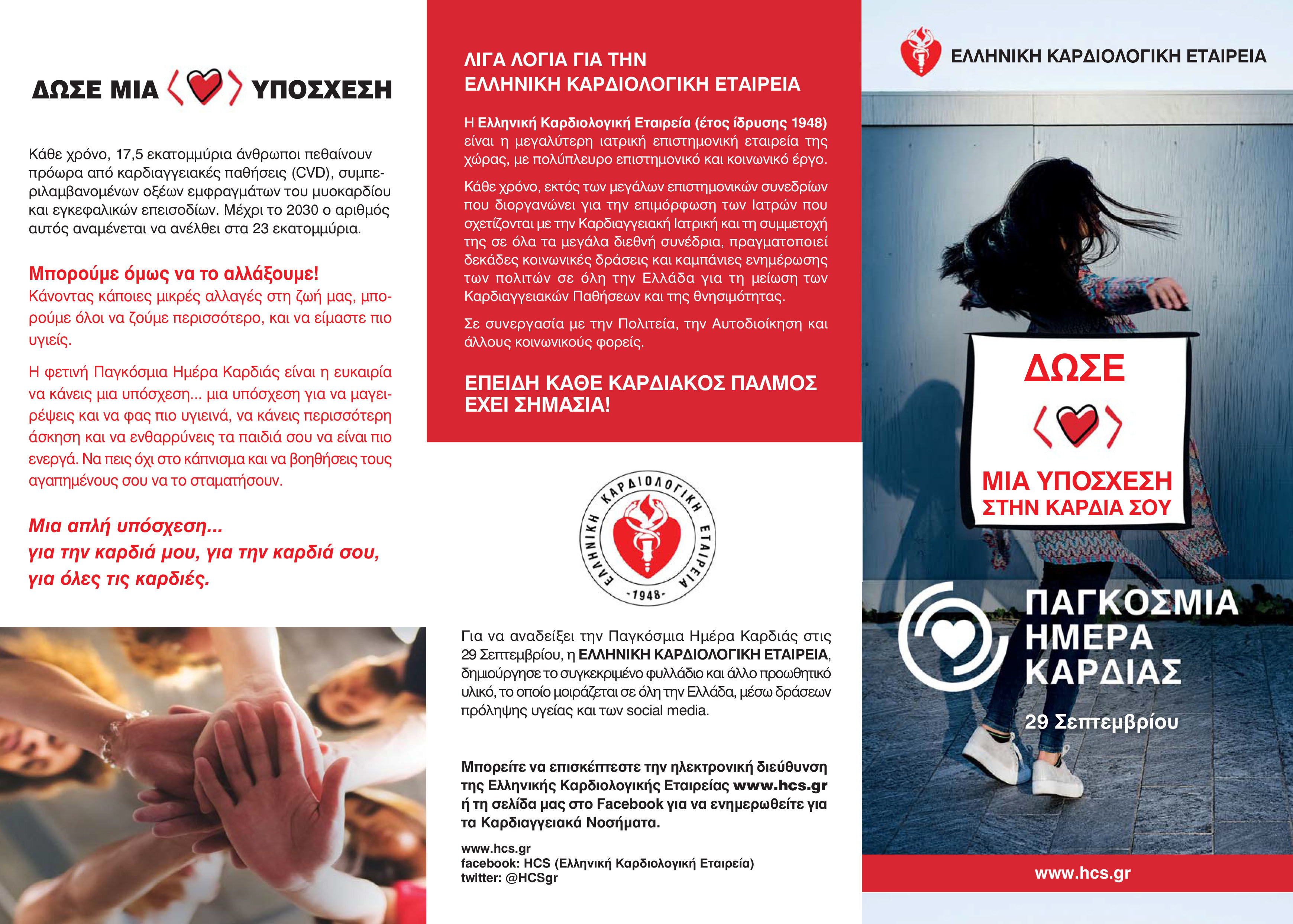 Με αφορμή την Παγκόσμια Ημέρα Καρδιάς, στις 29 Σεπτεμβρίου, συμμετέχοντας ενεργά όπως κάθε χρόνο στην καμπάνια του World Heart Day, η ΕΛΛΗΝΙΚΗ ΚΑΡΔΙΟΛΟΓΙΚΗ ΕΤΑΙΡΕΙΑ δημιούργησε πολυσέλιδο φυλλάδιο και άλλο προωθητικό υλικό, το οποίο θα μοιραστεί στην Ελλάδα, μέσω ενημερωτικών δράσεων πρόληψης υγείας για τους πολίτες και των social media.