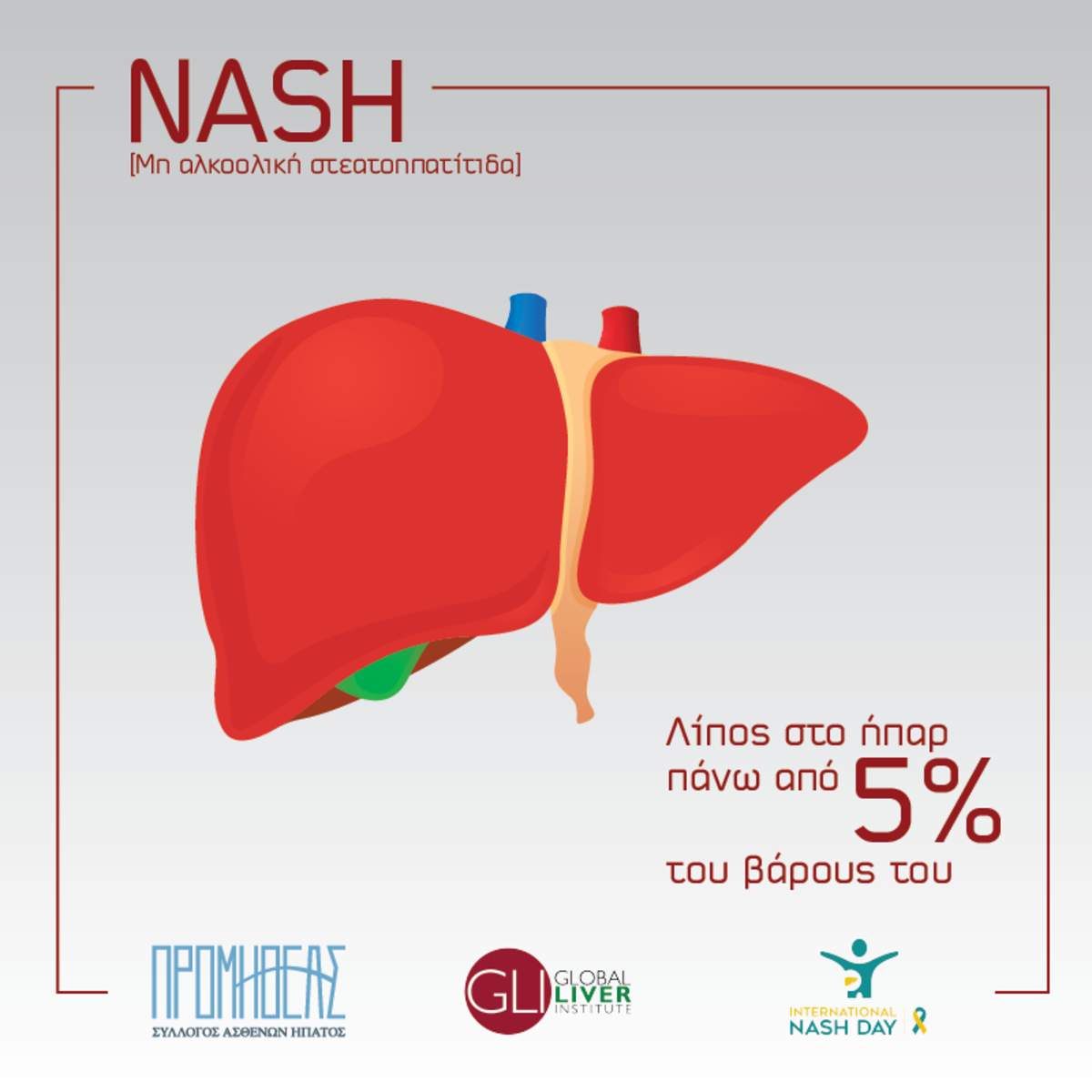 Ο Σύλλογος Ασθενών Ήπατος Ελλάδος «Προμηθέας» αναγνωρίζει την Παγκόσμια Ημέρα μη Αλκοολικής Στεατοηπατίτιδας (NASH) και να ενώνει τη φωνή του με τον οργανισμό «Global Liver Institute» στη μάχη έναντι στη νόσο NASH.