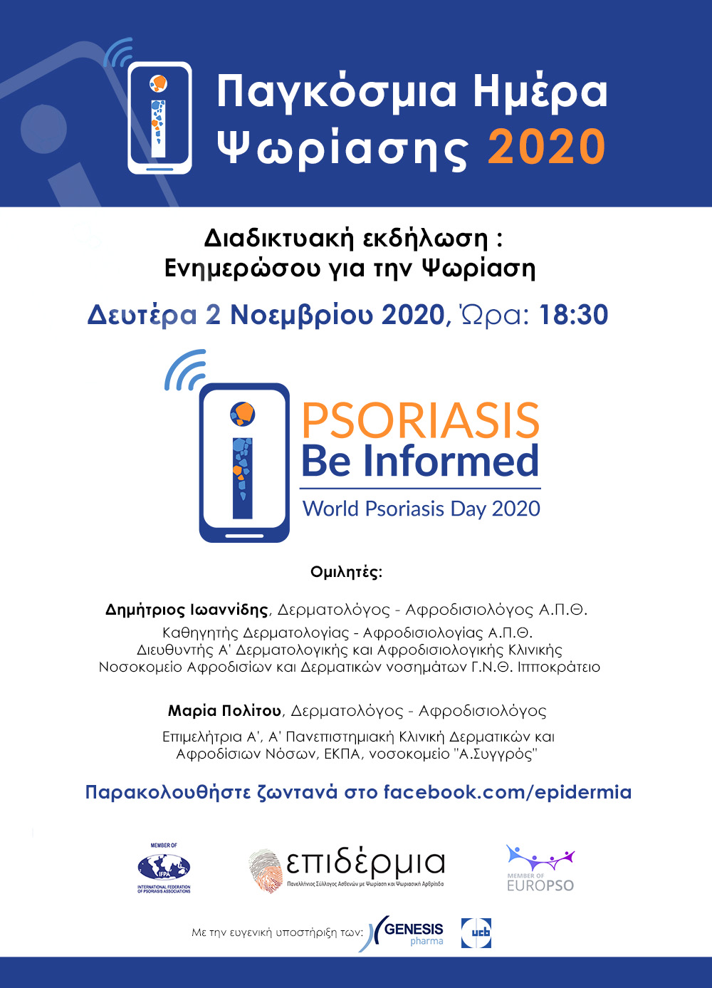 Ο Πανελλήνιος Σύλλογος Ασθενών με Ψωρίαση και Ψωριασική Αρθρίτιδα, Επιδέρμια, με αφορμή την Παγκόσμια Ημέρα Ψωρίασης, διοργανώνει διαδικτυακή εκδήλωση-webinar με τίτλο «Ενημερώσου για την Ψωρίαση» την Δευτέρα 2 Νοεμβρίου 2020, ώρα 18:30, στο facebook.com/epidermia.