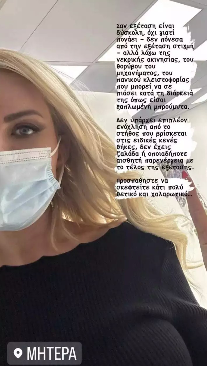 «Σαν εξέταση είναι δύσκολη, όχι γιατί πονάει – δεν πόνεσα από την εξέταση στιγμή αλλά λόγω της νεκρικής ακινησίας, του θορύβου του μηχανήματος, του πανικού κλειστοφοβίας που μπορεί να σε πιάσει κατά τη διάρκειά της όπως είσαι ξαπλωμένη μπρούμυτα», γράφει η παρουσιάστρια, περιγράφοντας τον τρόπο της διαγνωστικής εξέτασης.