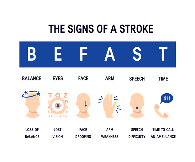BE-FAST είναι η αντιστοιχία για το ΜΙ-ΠΑΔΩ: Μάτια, Ισορροπία, Πτώση προσώπου, Αδυναμία χεριών, Δυσκολία ομιλίας, Ώρα να καλέσετε το 166.