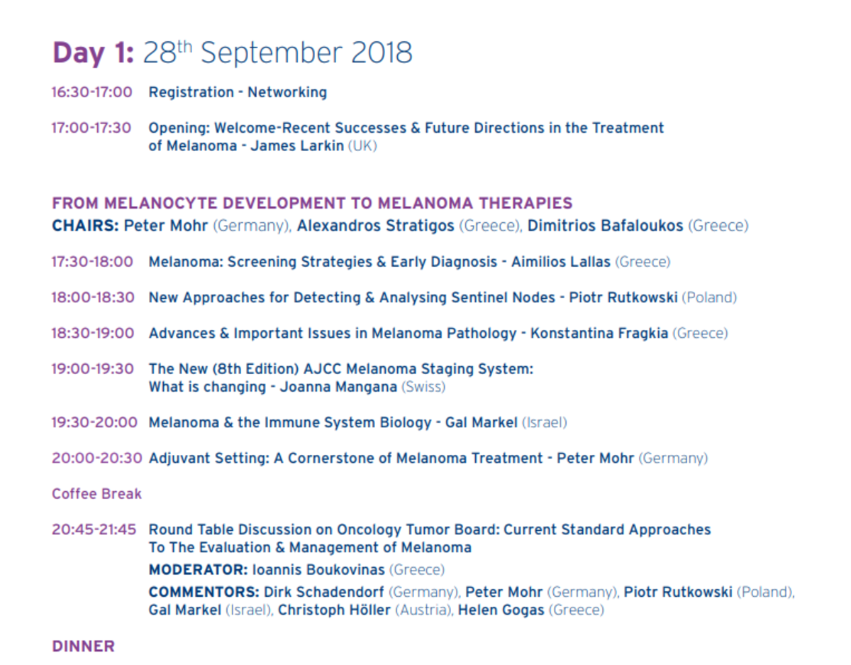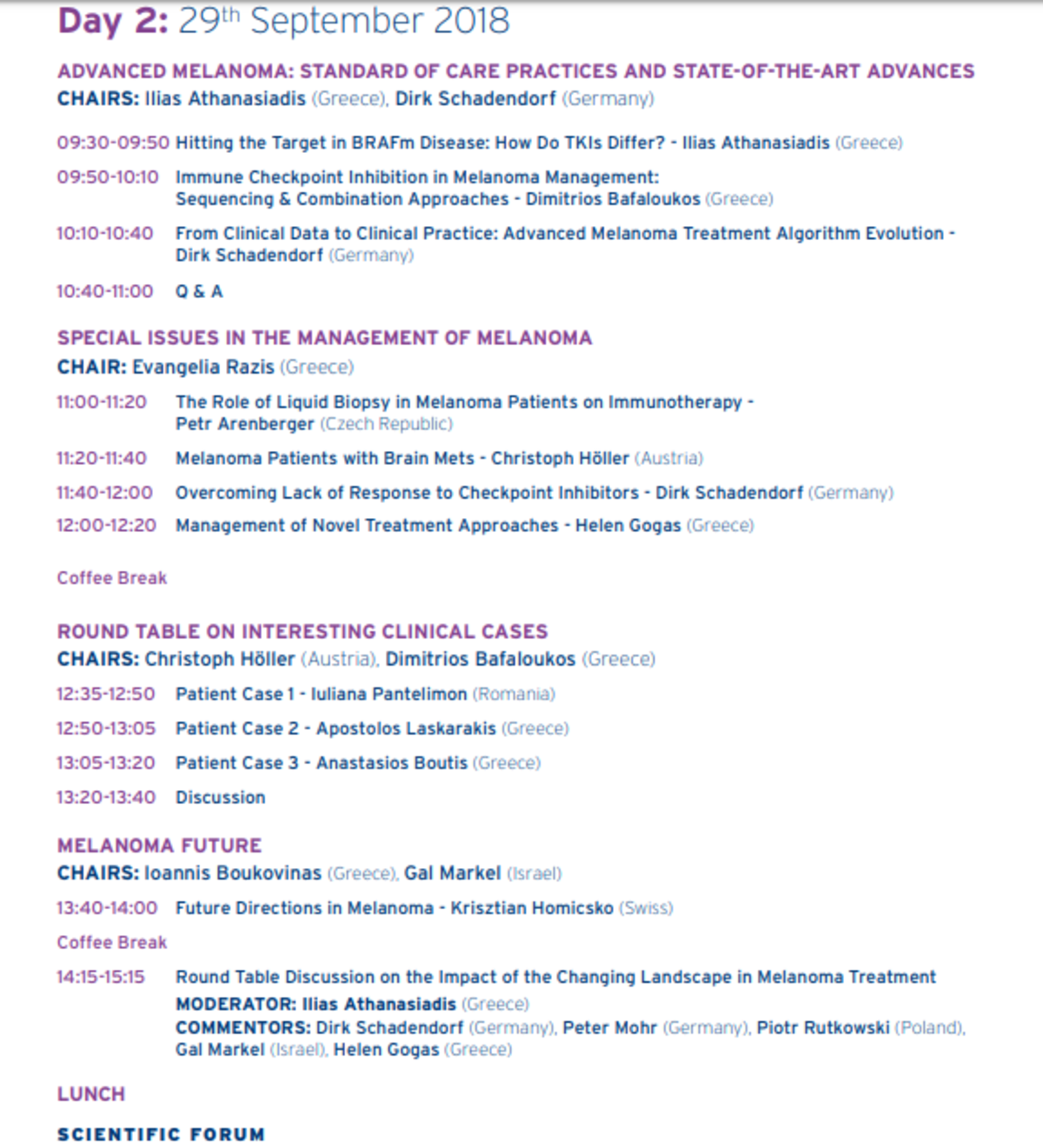 Το συγκεκριμένο Forum αποτελεί μια εξαιρετικά σημαντική ευκαιρία ενημέρωσης της επιστημονικής κοινότητας σχετικά με τις πρόσφατες επιστημονικές εξελίξεις στην πρόληψη και τη διάγνωση του μελανώματος, την κλινική εφαρμογή των νέων θεραπειών, τους προβληματισμούς για την καλύτερη προσέγγιση και διαχείριση των ασθενών με μεταστατικό μελάνωμα και την αντιμετώπιση της νέας τάξης των παρενεργειών. Τέλος, επιστημονικές εκδηλώσεις αυτού του είδους, αποτελούν αφορμή για την ενίσχυση των συνεργασιών μεταξύ των χωρών με στόχο την προαγωγή της έρευνας στον τομέα του μελανώματος».
