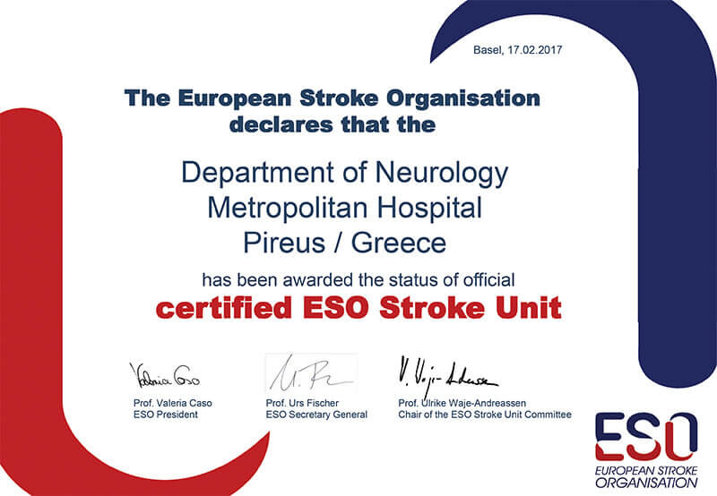 Είναι σπουδαίο και ελπιδοφόρο το γεγονός ότι, αντιμέτωπο με τους παραπάνω αριθμούς, το Μetropolitan Hospital τιμήθηκε από τον Ευρωπαϊκό Οργανισμό “European Stroke Organisation” με το πιστοποιητικό «Certified ESO Stroke Unit».