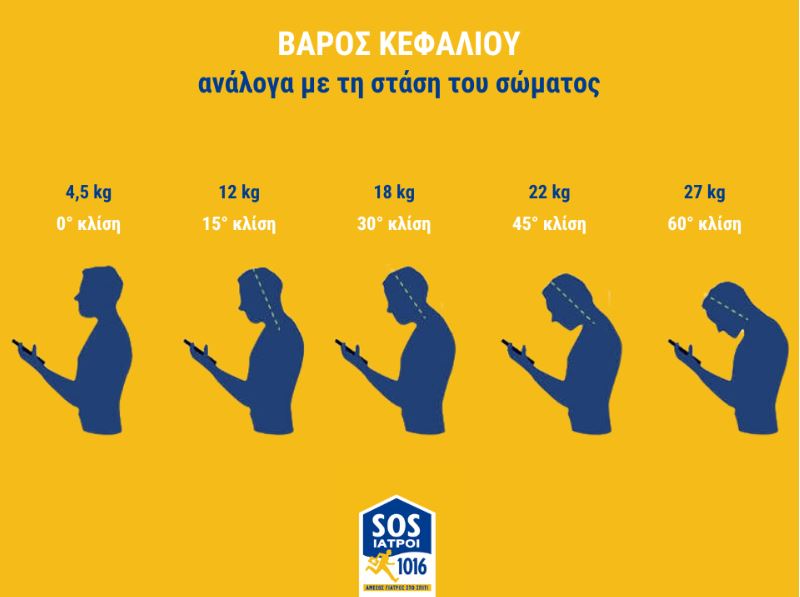 Μια αναφορά στο Neuro and Spine Surgery Journal αναφέρει ότι ένα κεφάλι ενηλίκου ζυγίζει 4,5kg κιλά στην ουδέτερη θέση. Όταν το κεφάλι γέρνει προς τα εμπρός στην μπροστινή στάση του κεφαλιού ενώ κοιτάζετε το κινητό τηλέφωνο, το βάρος στο λαιμό αυξάνεται στα: