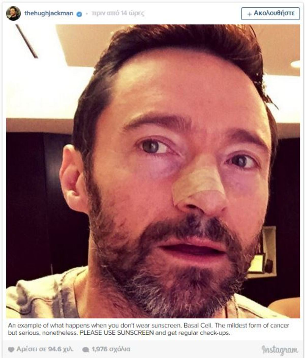 «Ένα παράδειγμα του τι συμβαίνει όταν δεν φοράς αντιηλιακό. Βασικοκυτταρικό καρκίνωμα. Η ηπιότερη μορφή καρκίνου, εντούτοις σοβαρή. ΣΑΣ ΠΑΡΑΚΑΛΩ ΧΡΗΣΙΜΟΠΟΙΕΙΤΕ ΑΝΤΗΛΙΑΚΟ και να υποβάλλεστε συχνά σε ιατρικούς ελέγχους» έγραψε ο Τζάκμαν στην ανάρτησή του στο Instagram.